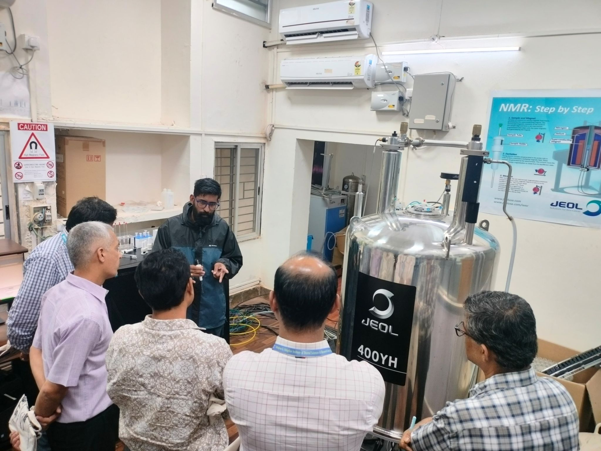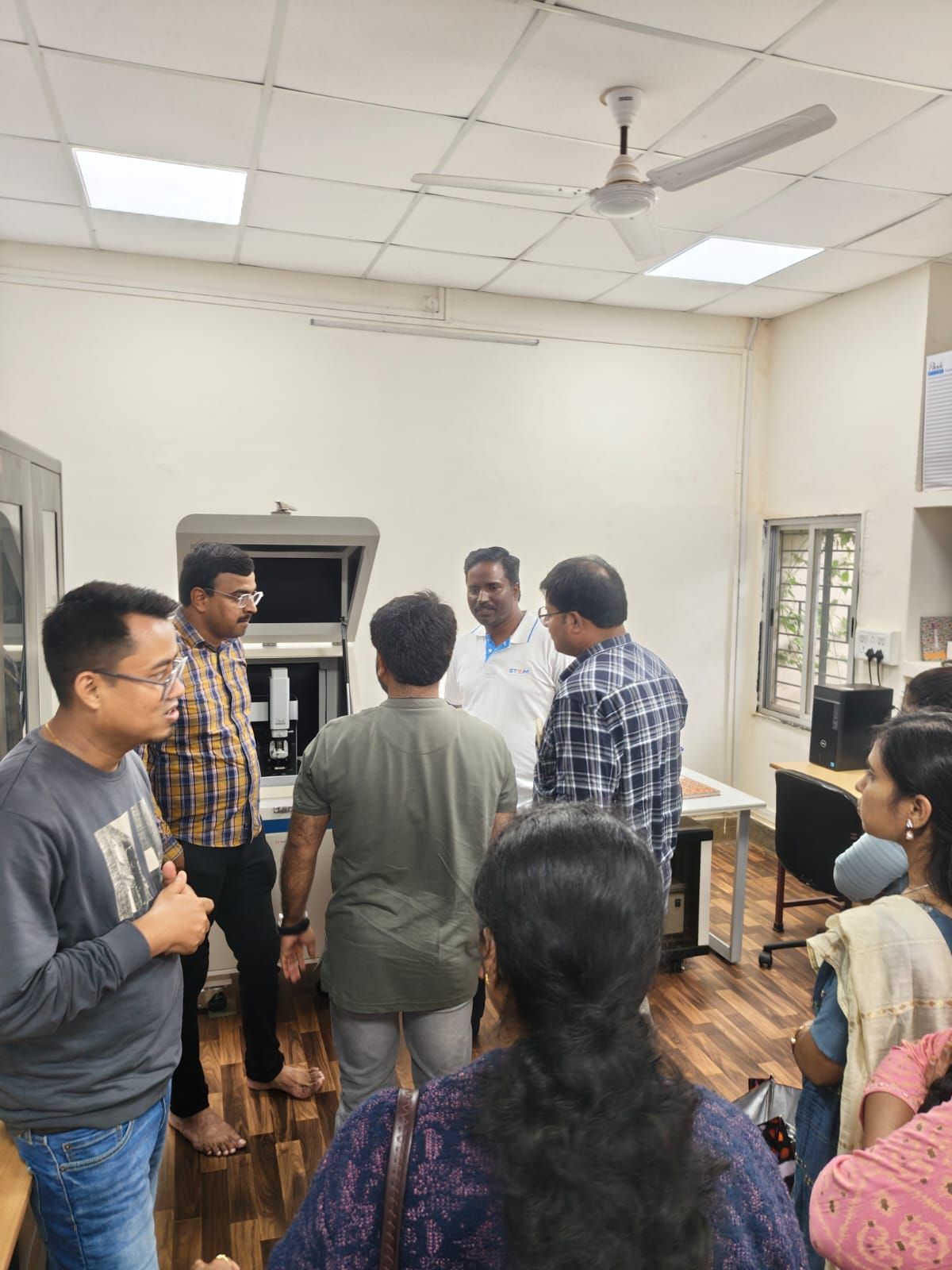 Advanced Equipment Demos at IIT Dharwad! NMR Demo Session by Mr. Deepak P P (JTS). FESEM Demo by Mr. Praveen Naikar. AFM Demo by Mr. Pilik. Participants are witnessing cutting-edge research tools in action!