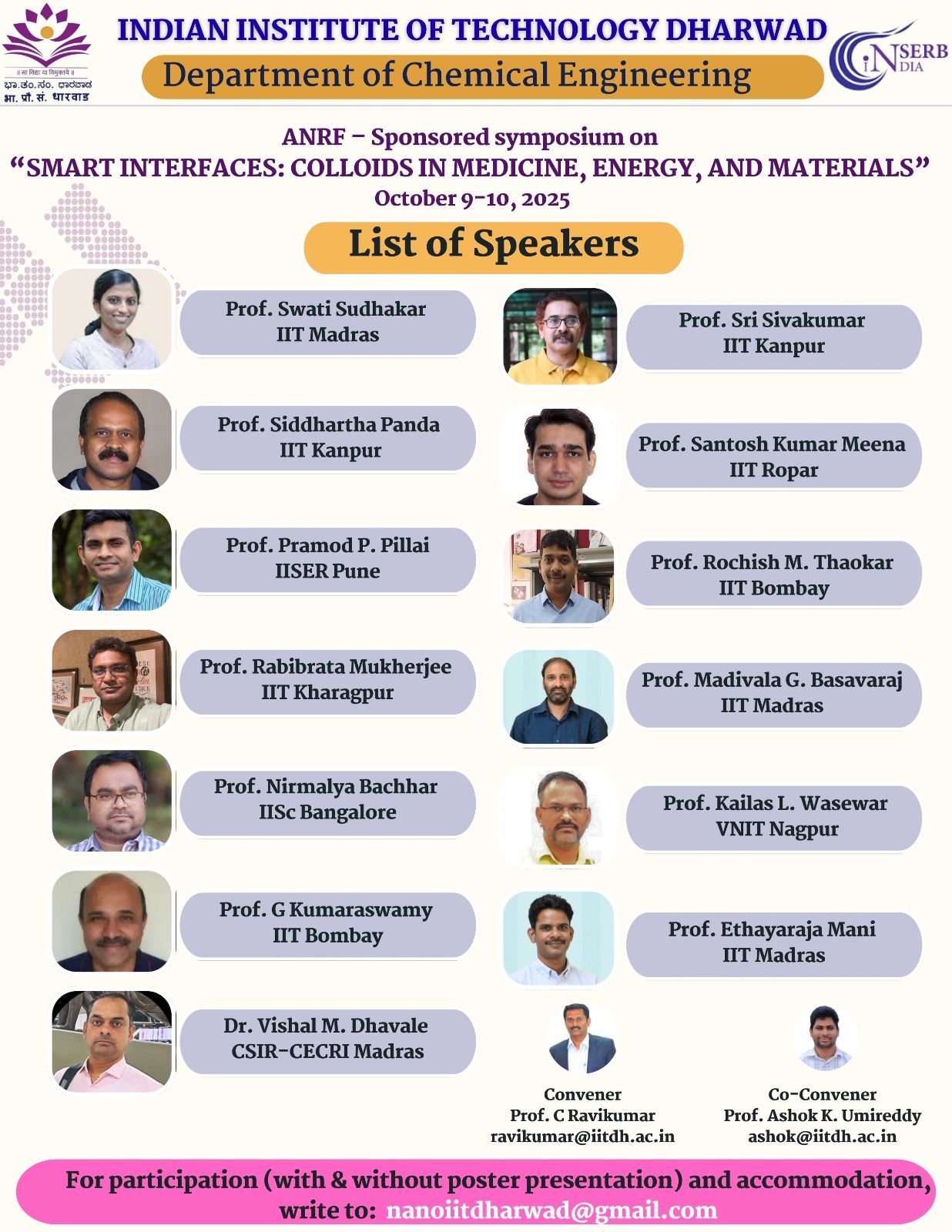 The Department of Chemical Engineering, IIT Dharwad is pleased to announce a two-day symposium on “Smart Interfaces: Colloids in Medicine, Energy, and Materials”, to be held on October 9–10, 2025, at IIT Dharwad.