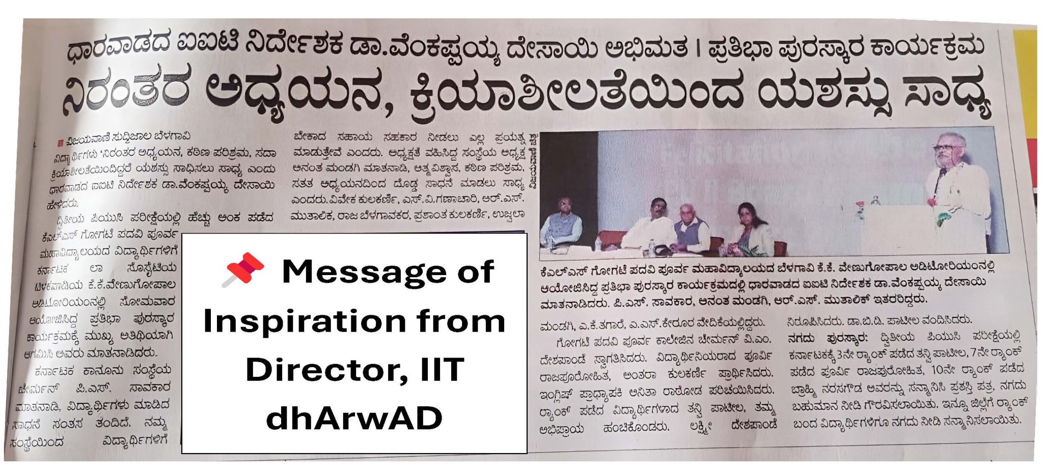 PROF. VenkappayyA R. dEsAi, Director of IIT dhArwAD, addressed students at the PratibhA PuraskAr event held at K.L.S. Gogte Pre-University College, BeLagAvi, on 19th April 2025.