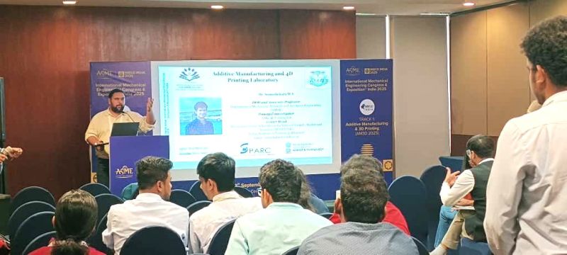 Mr. Prashant Veer from the Additive Manufacturing and 4D Printing (AM4D) Lab, IIT Dharwad, presented his research on “Enhancing Surface Properties of Directed Energy Deposition Additive Manufactured Components Through Shot Peening” at the ASME International Mechanical Engineering Congress & Exposition® (IMECE India 2025), held at the Hyderabad International Convention Center, Hyderabad, from 10–13 September 2025.
