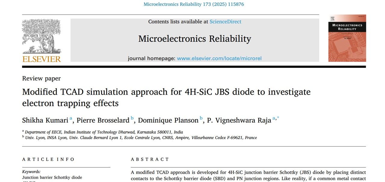 Ms. Shikha Kumari published her research work titled “Modified TCAD simulation approach for 4H-SiC JBS diode to investigate electron trapping effects” in Microelectronics Reliability Journal. The device characterization and simulation facilities at IIT Dharwad were used for this cutting-edge research. This work is benefited by the collaboration with Ampere Lab, INSA Lyon, France. We would like to thank Prof. Mayank Shrivastava and his research team for performing high-voltage reverse IV measurements at MSD Lab, IISc, India. The paper can be accessed through this shared link: https://lnkd.in/dHpk_cqG