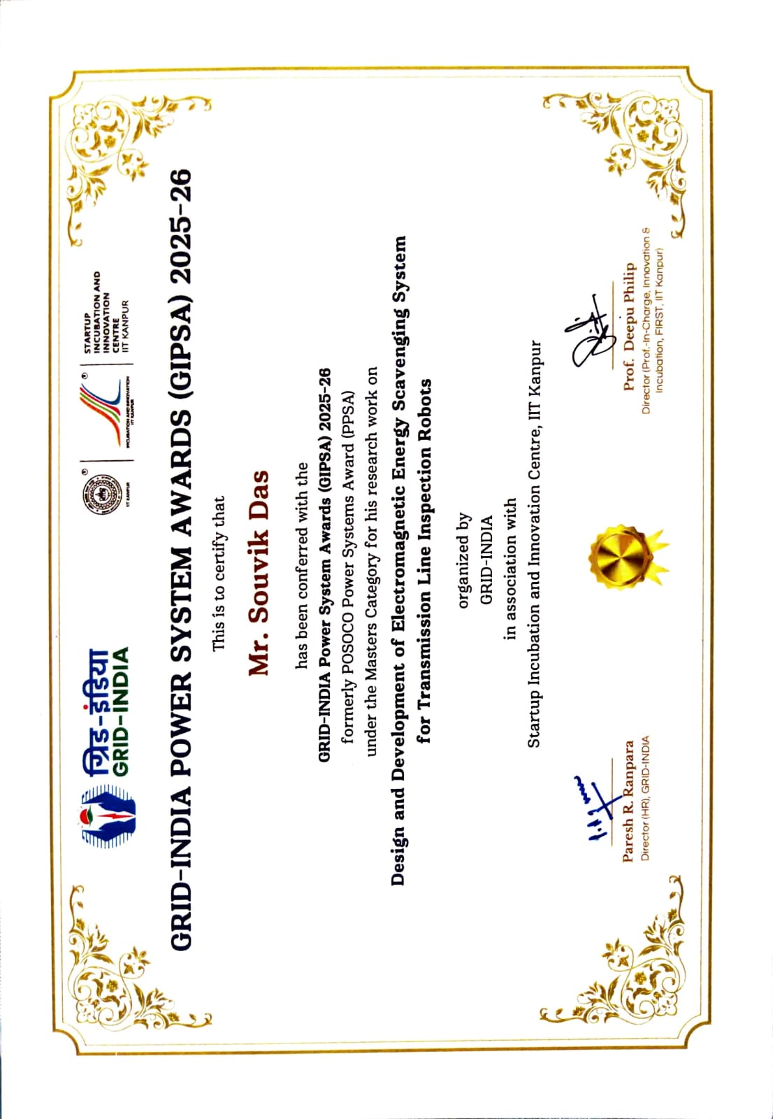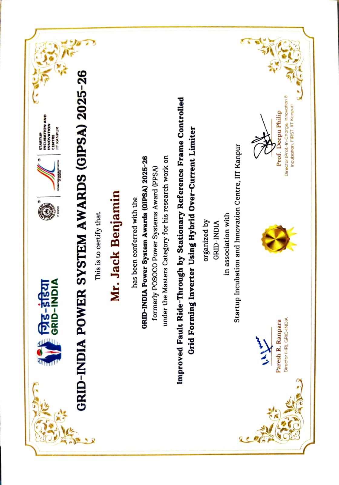 We are delighted to share that our MS students, Mr. Souvik Das, supervised by Prof. Abhijit with co-supervision from Prof. Pratyasa Bhui, and Mr. Jack Benjamin, supervised by Prof. Pratyasa Bhui with co-supervision from Prof. Animesh Kumar Sahoo, have been honored with the prestigious Grid India Power Systems Award (GIPSA) for Best Thesis, jointly conferred by the Grid Controller of India (formerly POSOCO) and IIT Kanpur at the award ceremony held on 7 December 2025 at IIT Hyderabad.