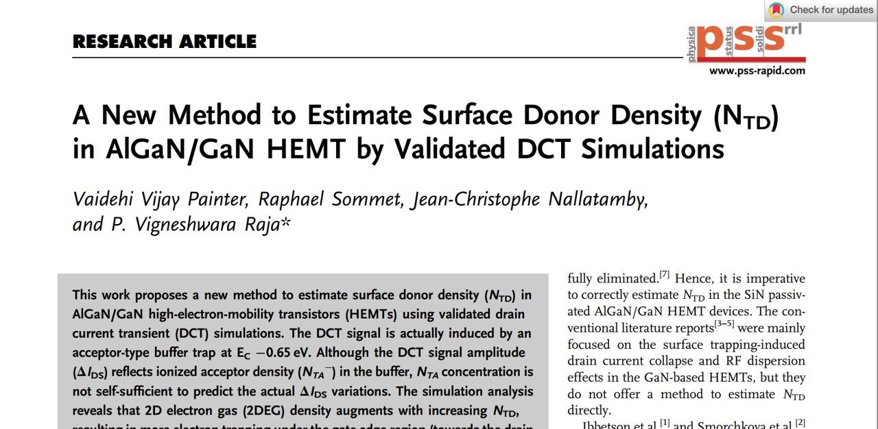 Ms. Vaidehi Painter (Dept. of EECE) has published her research titled “A New Method to Estimate Surface Donor Density (NTD) in AlGaN/GaN HEMT by Validated DCT Simulations” in Physica Status Solidi (RRL) – Rapid Research Letters.