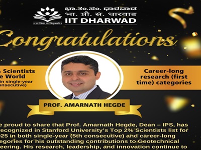 Prof. Amarnath Hegde, Dean – Infrastructure, Planning & Support (IPS), has been recognized in Stanford University’s Top 2% Scientists list for 2025 in both single-year (5th consecutive) and career-long research (first time) categories. This honors his outstanding contributions to the research in the field of Geotechnical Engineering. Stanford classifies scientists across 22 fields and 174 sub-fields, evaluating single-year and career-long impact. His recognition highlights years of dedicated research, academic leadership, and innovation, inspiring engineers and researchers.