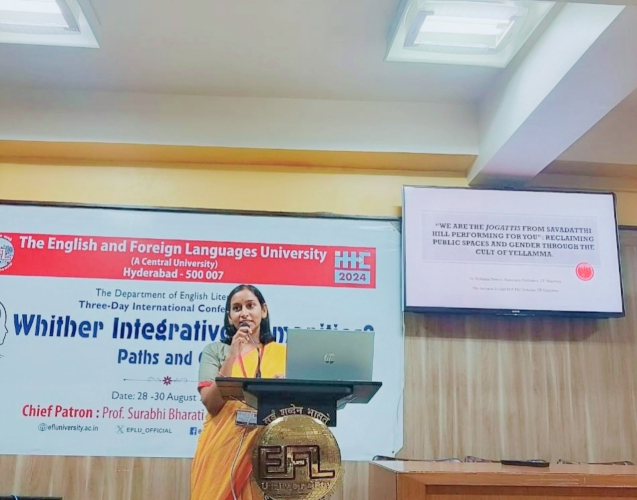 Prof. Ridhima Tewari's research group from the field of English Literary Studies made two well-received presentations at the International Conference on 'Whither Integrative Humanities' organised by the English and Foreign Languages University Hyderabad. Prof. Tewari's PhD students Ms Sanjana Sukyii and Mr Tajuddeen Nadaf co-presented their works along with Prof. Tewari. The conference included presenters from various IITs including IIT Kanpur, IIT Roorkee, IIT Hyderabad, to name a few. Prof. Tewari was also listed as an eminent speaker for the event.