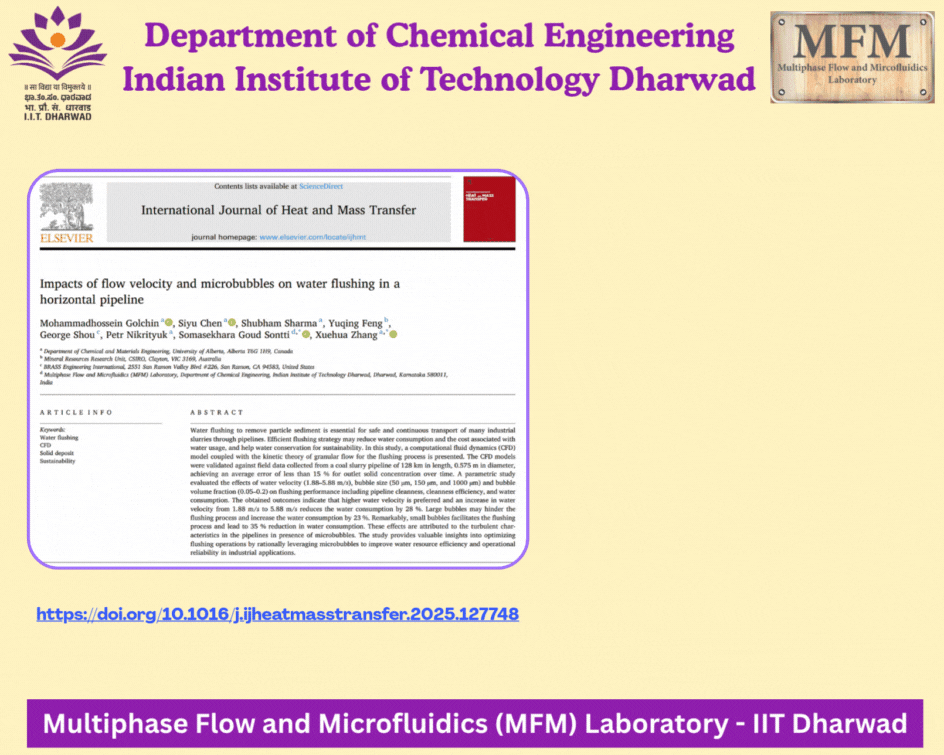 We are pleased to share that Prof. Somasekhara Goud Sontti, Department of Chemical Engineering, IIT Dharwad, in collaboration with Prof. Xuehua Zhang from the University of Alberta, Canada, has published a research article in the International Journal of Heat and Mass Transfer (Q1, Impact Factor: 5.8). This study provides new insights into enhancing pipeline cleaning efficiency using microbubbles and sustainable flow management approaches.